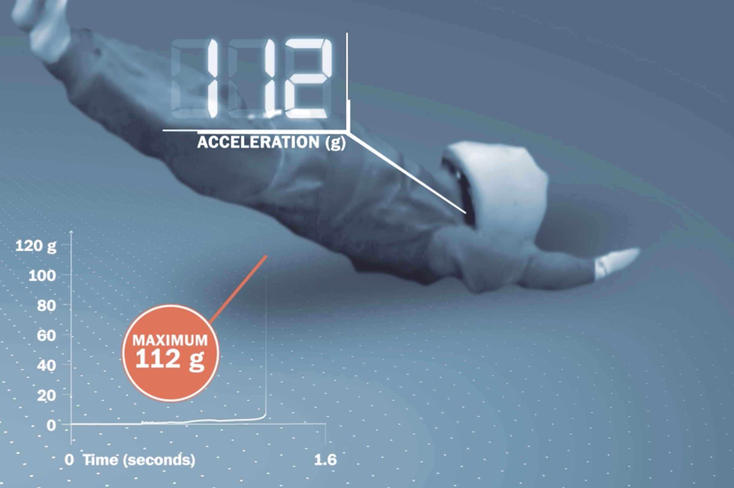Les secouements ont généré un pic entre 6 et 8 G, c'est à dire huit fois l’accélération due à la gravité, soit deux fois plus que celle produite lors d’un saut d'obstacles, contre un pic de 112 G lorsqu'il y avait un impact direct sur la tête lors d'une chute.