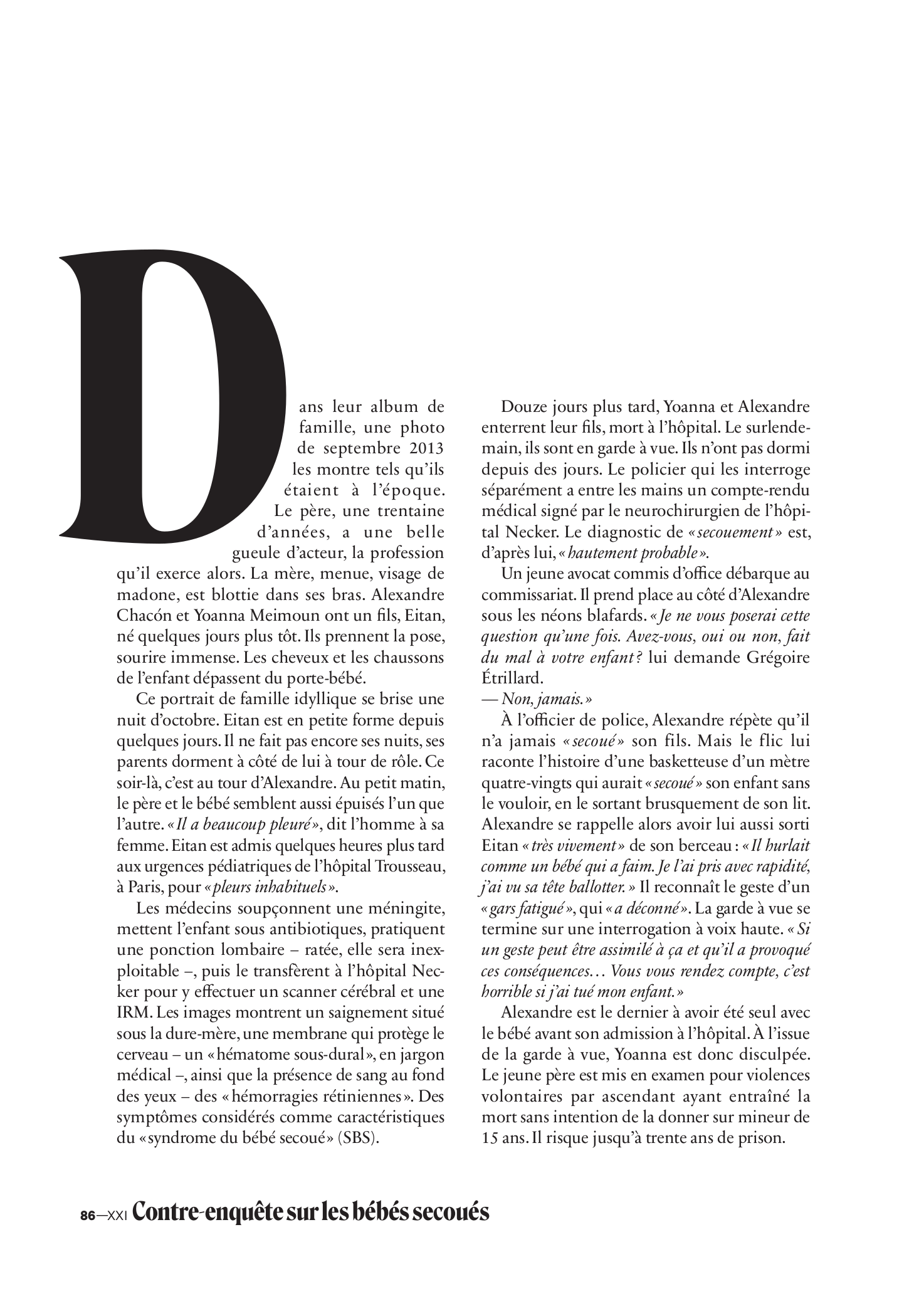 La revue trimestrielle Revue XXI publie aujourd'hui, dans le numéro 58 de ce printemps 2022, une longue enquête de dix-huit pages sur la controverse médico-judiciaire autour du syndrome du bébé secoué (en page 84).