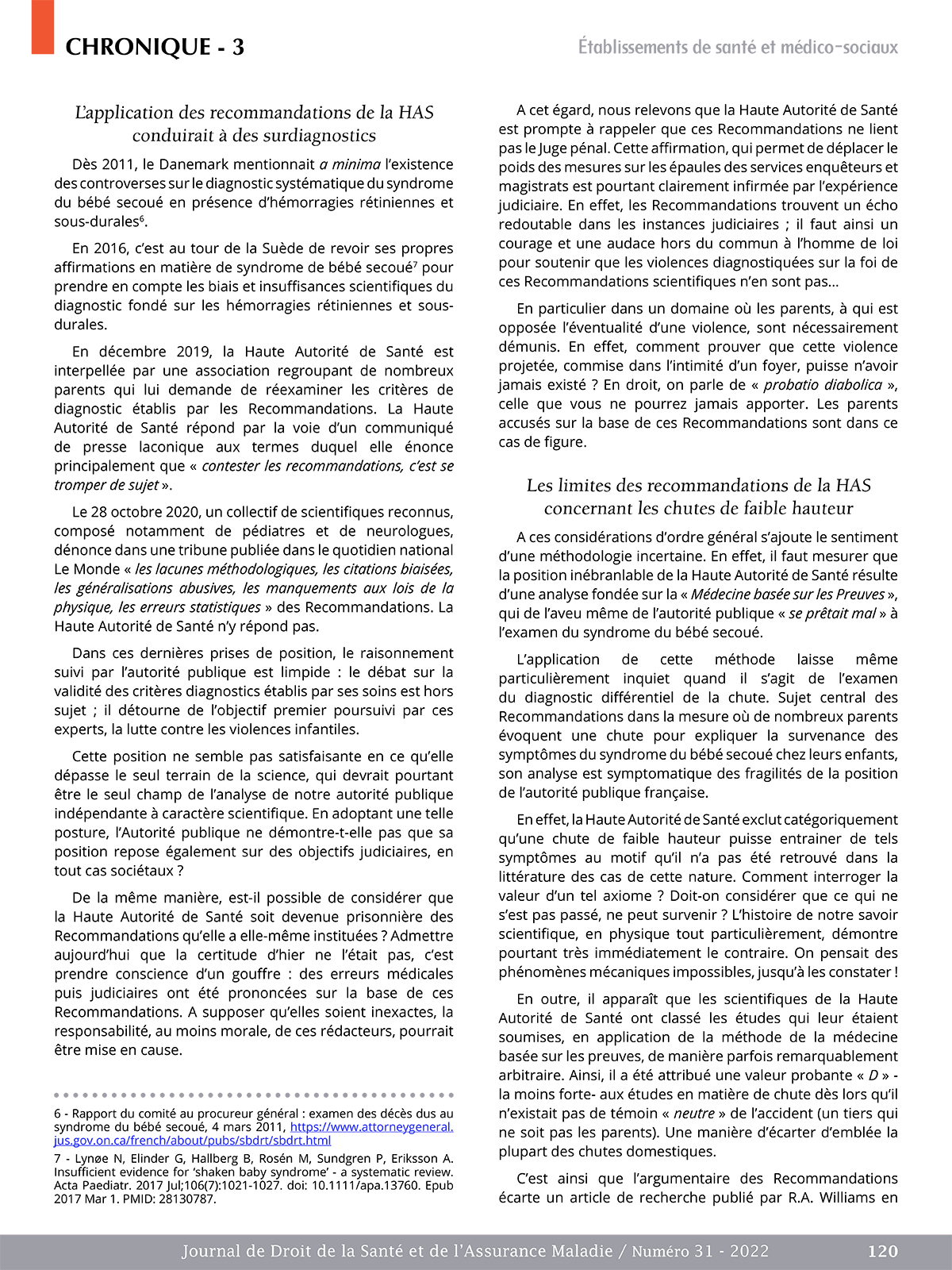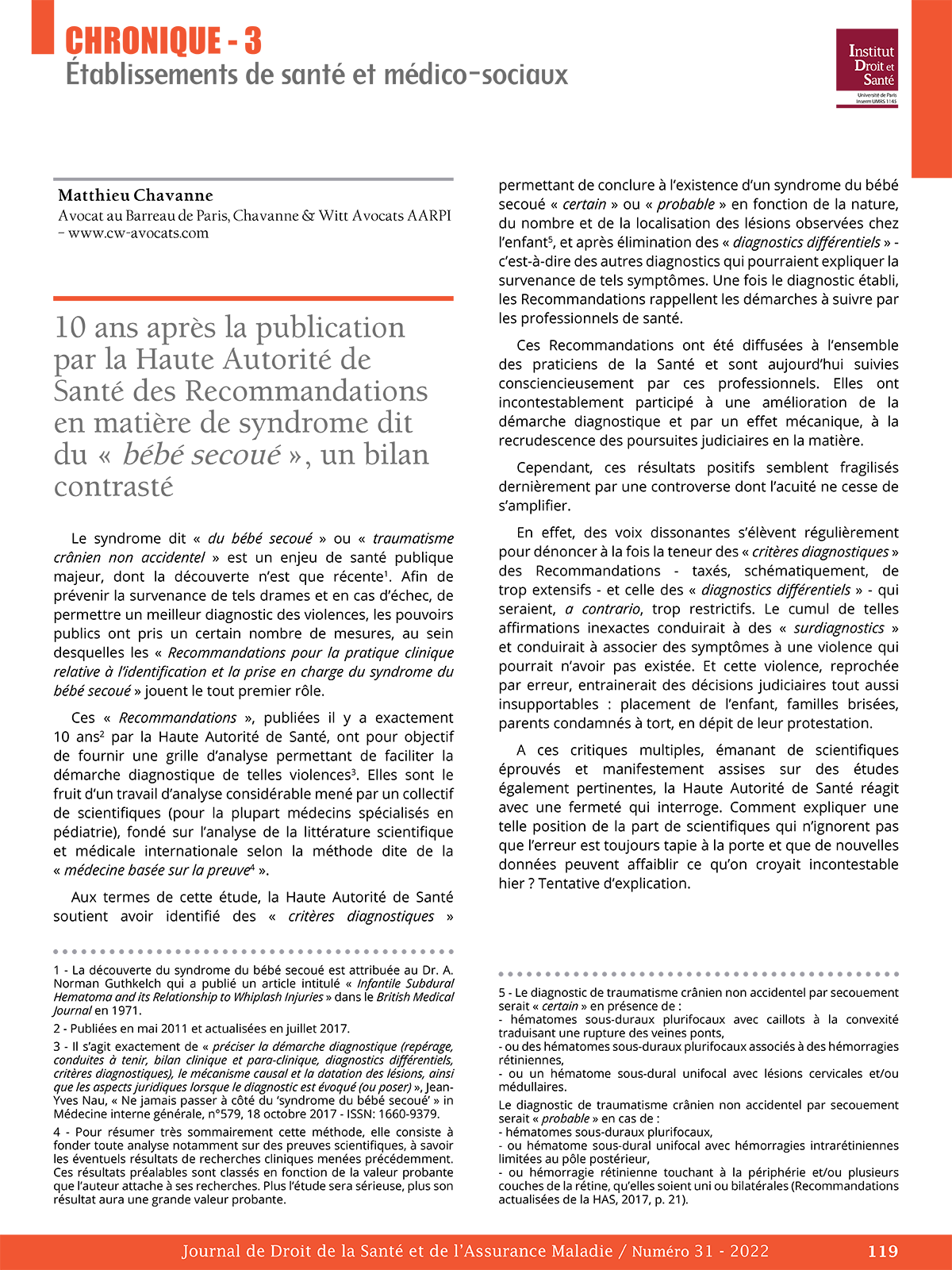 Le Journal de Droit de la Santé et de l’Assurance Maladie publiait en 2022, dans son numéro 31, un article de l'avocat pénaliste Matthieu Chavanne sur les recommandations de la Haute Autorité de Santé (HAS) sur le syndrome du bébé secoué (SBS). Cet article est disponible librement ici et nous le reproduisons ci-dessous.