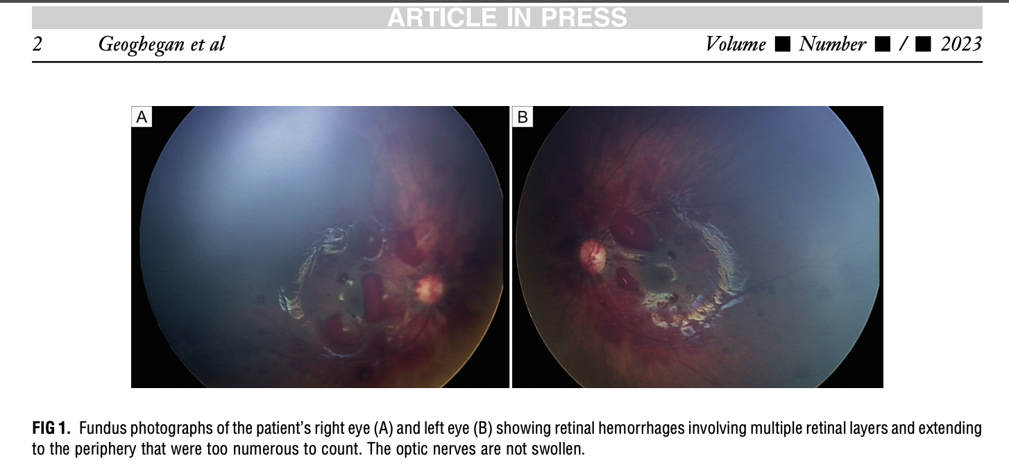 Les services d'urgences ont été appelés et l'enfant a été transféré à l'hôpital. Un scanner cérébral à montré l'existence d'hématomes sous-duraux droits sans fracture du crâne. Un fond d'œil a montré l'existence d'hémorragies rétiniennes bilatérales trop nombreuses pour être comptées, et impliquant plusieurs couches de la rétine. Les hémorragies rétiniennes étaient sévères, concentrées dans le pôle postérieur mais s'étendant également à la périphérie. Un rétinoschisis n'a pas pu être identifié formellement.