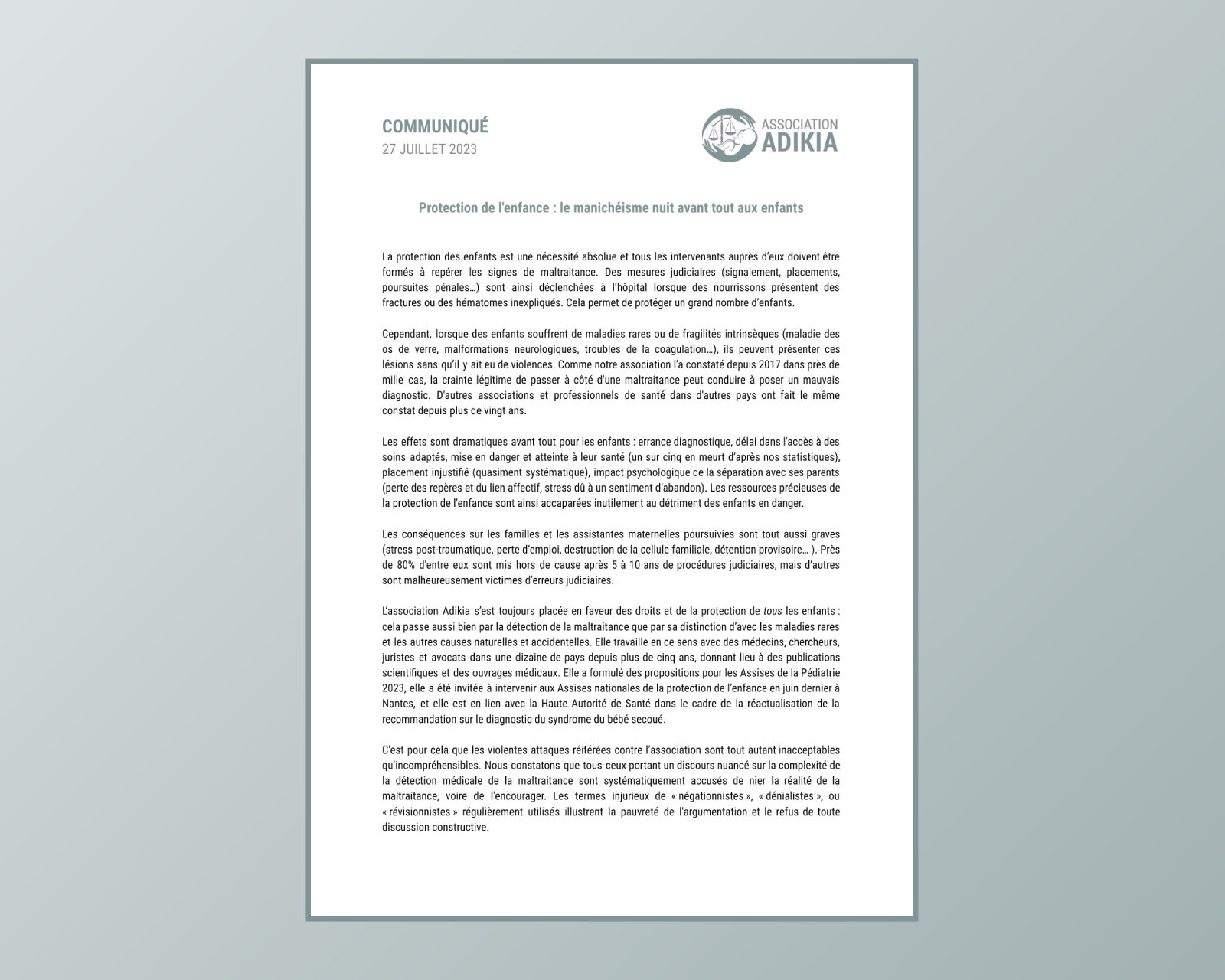 Communiqué du 27 juillet 2023. La protection des enfants est une nécessité absolue ...