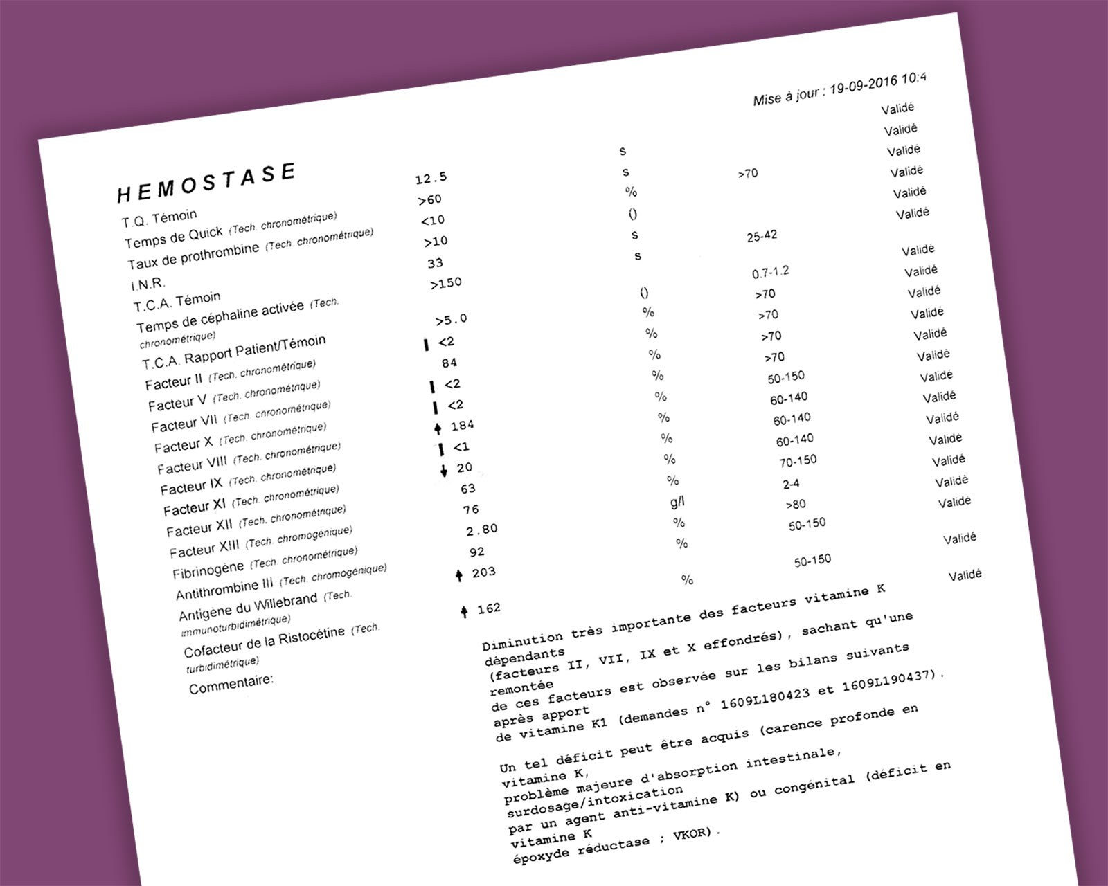 Des prises de sang lui ont été faites et on nous a informés qu’il avait un INR > 10 (son sang ne coagule pas) et une énorme carence en vitamine K, suite à cela il lui a été administré de la vitamine K.