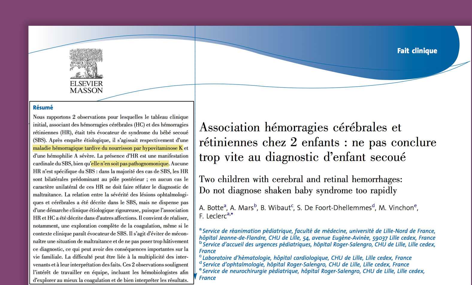Il y a des études scientifiques qui ont démontré que les hématomes sous-duraux ainsi que l'hémorragie rétinienne peuvent être la conséquence de différentes maladies, notamment en lien avec un déficit en vitamine K.